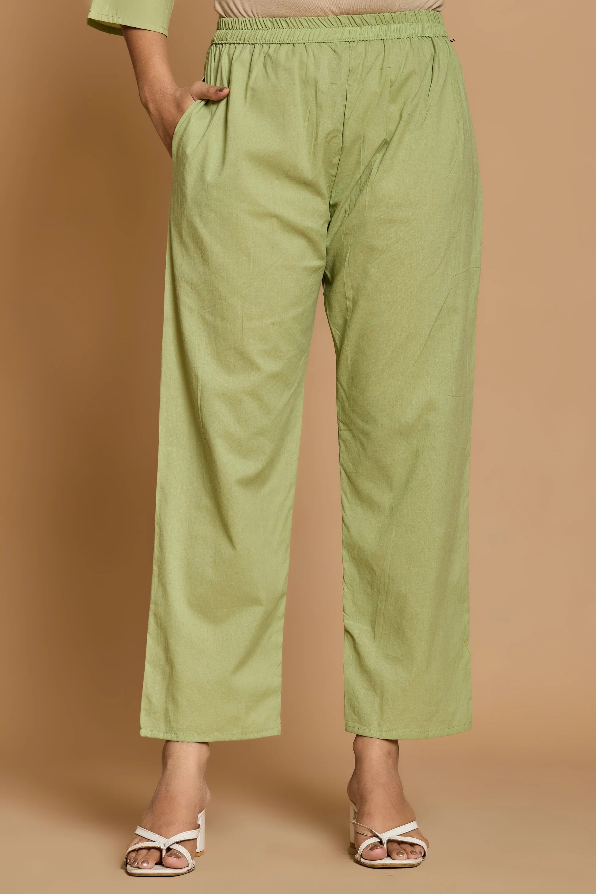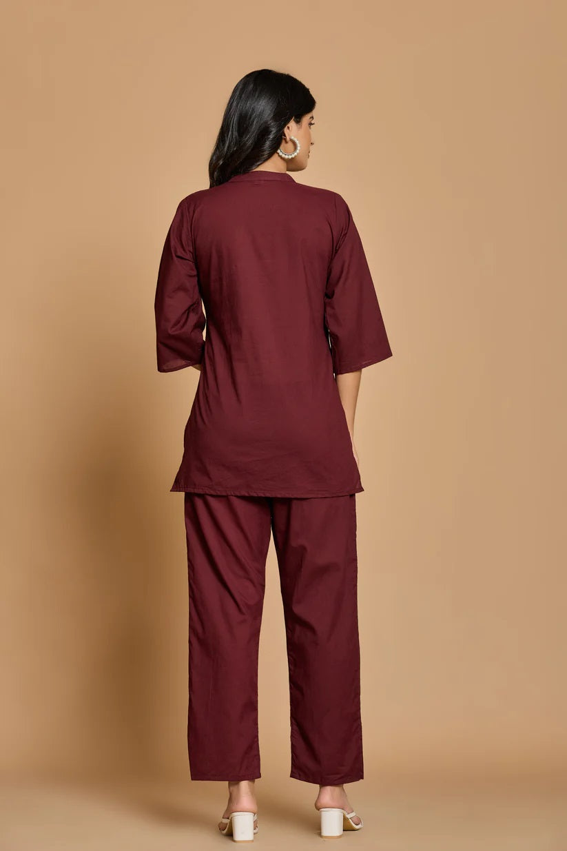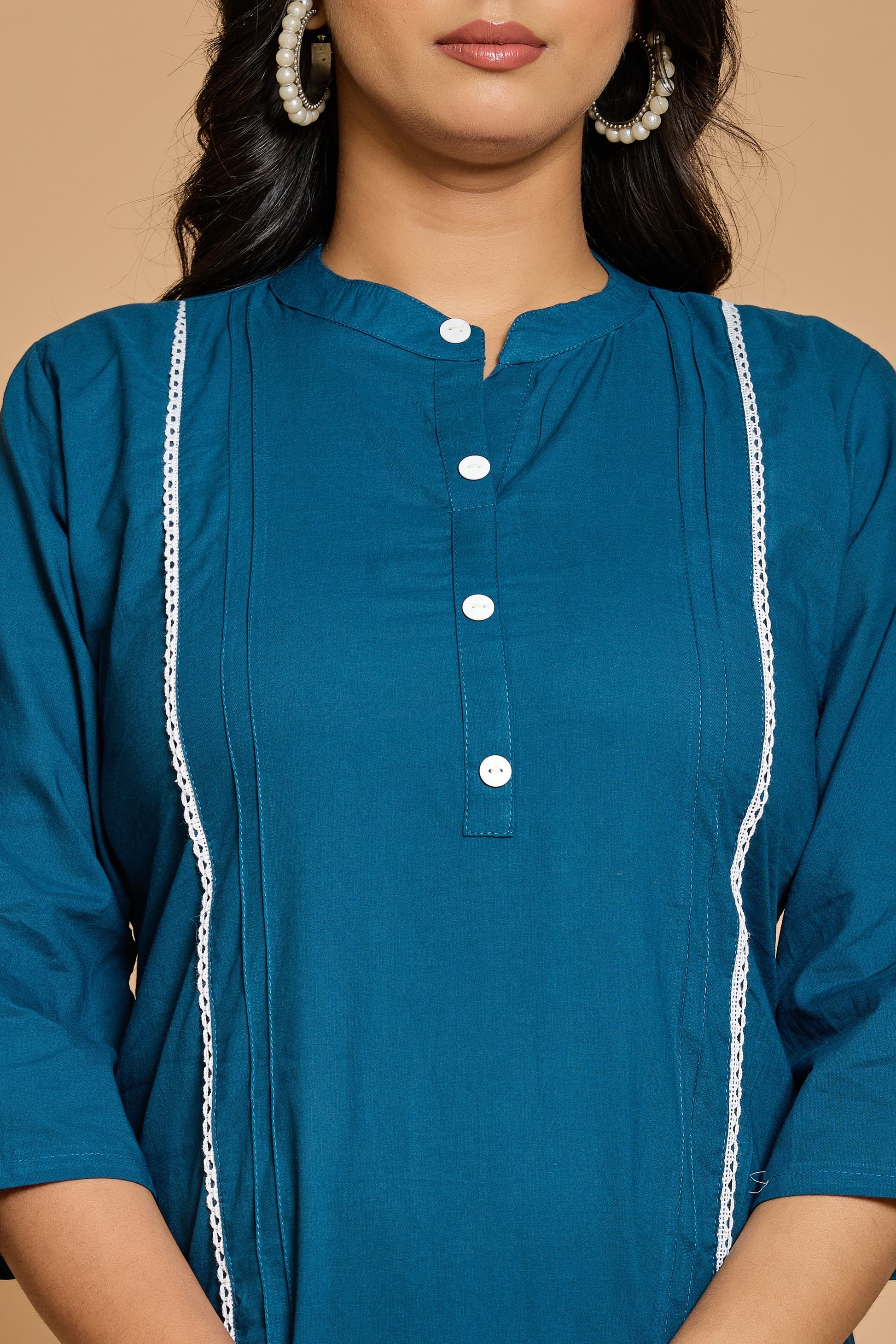 Upgrade your casual style with this Blue Solid Cotton Co-ord Set, featuring a tunic and matching trousers. The tunic comes with a smart mandarin collar, button closure, and three-quarter sleeves for a refined look. Paired with straight-fit trousers featuring an elasticated waistband and slip-on closure for comfort. Crafted from 100% pure cotton, this ready-to-wear set is soft, breathable, and easy to maintain with machine wash care.