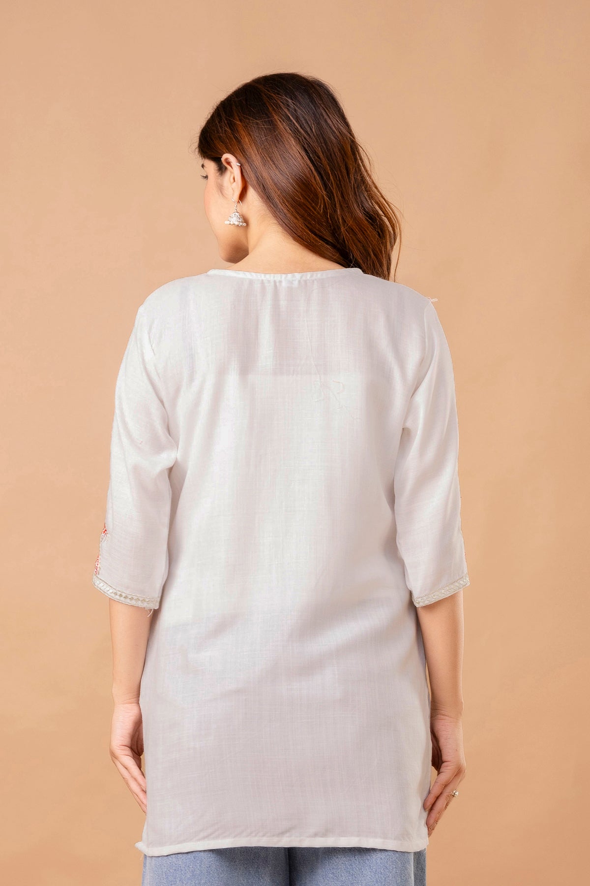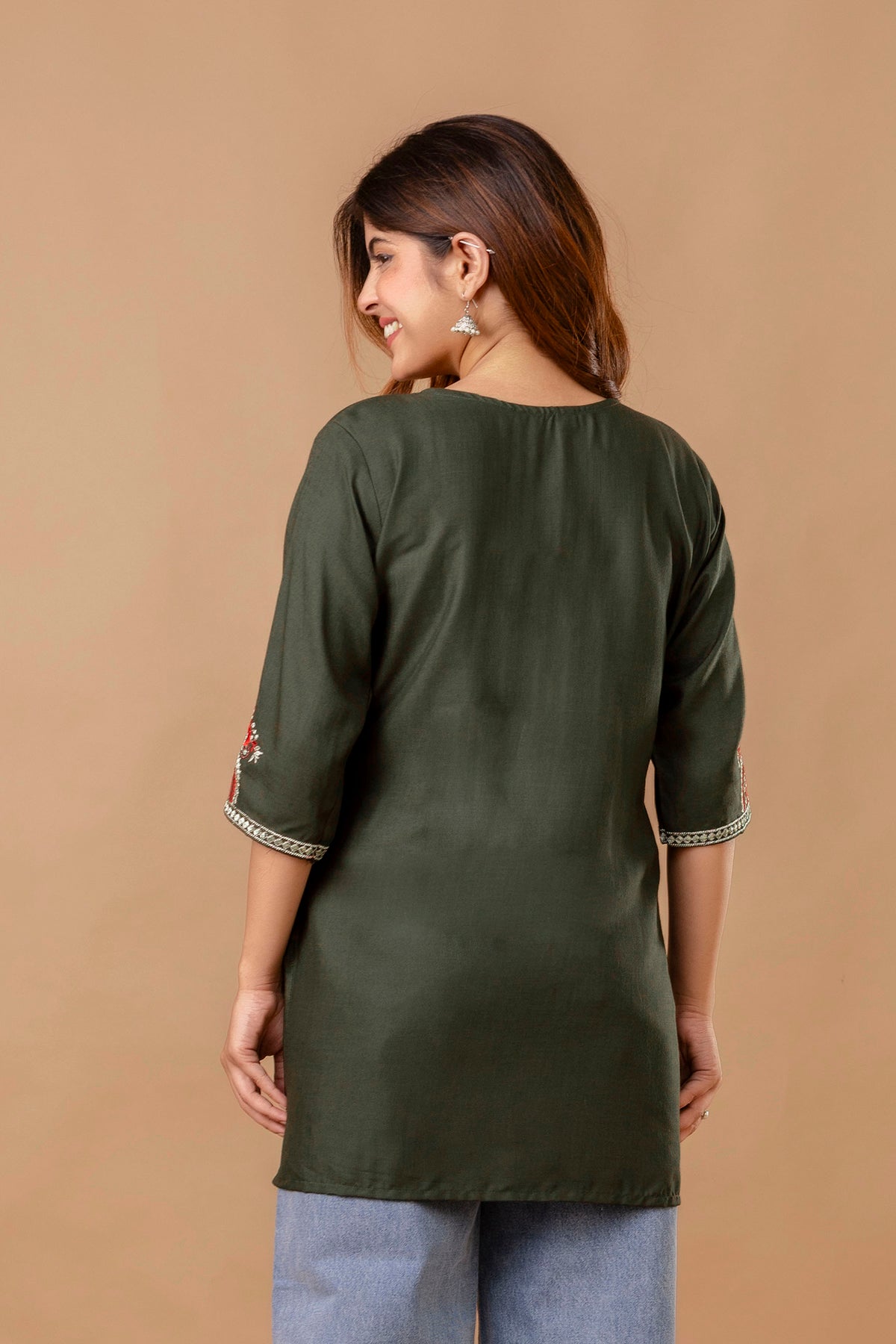 Enhance your everyday style with this elegant Regular Top, beautifully crafted from soft Rayon fabric. Featuring delicate embroidery, a flattering V-neckline, and three-quarter regular sleeves, it offers both comfort and sophistication. The embroidered detailing adds a charming touch, making it perfect for casual outings or semi-formal occasions. Lightweight, breathable, and easy to maintain with machine wash care — a versatile addition to your wardrobe.